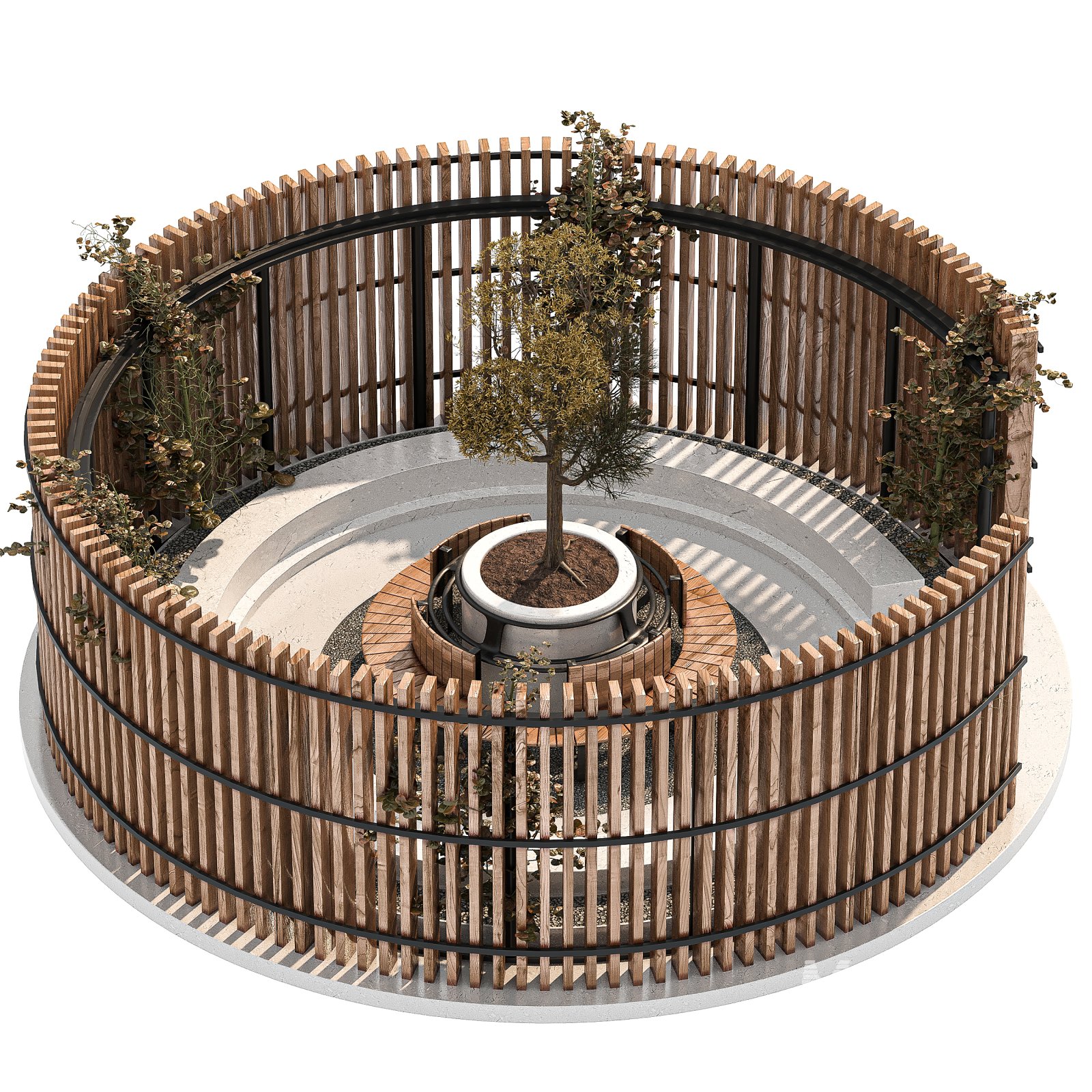 The Wooden Garden Pod 02 is a beautifully designed outdoor structure that combines natural materials with contemporary architectural aesthetics. This model features a circular wooden enclosure with vertical slats, offering both privacy and visual openness. At the center of the pod lies a round seating area surrounding a planted tree, creating a serene focal point for rest and relaxation.